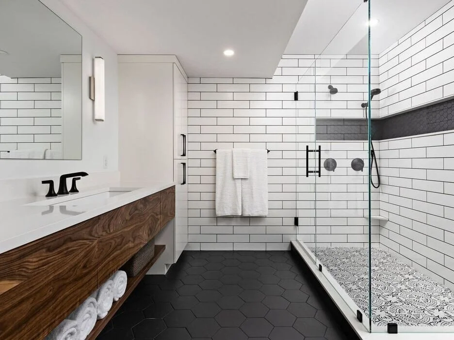 Here we see another great example of using different shapes and styles of tile in one space. Classic, white, half-offset subway tile on the wall contrasts the intricate design of the shower floor. Black, hexagonal tile flooring repeats on a smaller scale as a fun detail in the inlay of the shower. Although these looks are strikingly different, they coordinate well and together make a strong statement.