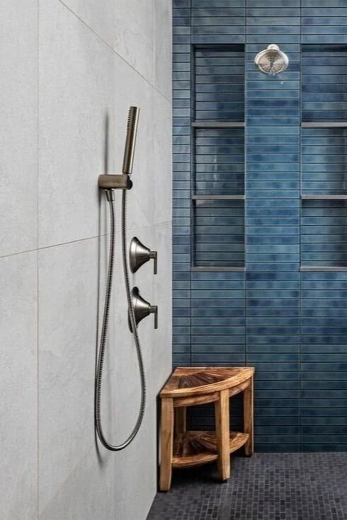 This unique shower displays several different tile trends. First, neutral, large-format tile is used on one wall. These oversized tiles make spaces feel bigger and minimize grout lines for easy cleaning. On the adjacent wall, rich, blue subway tiles are stacked straight and are longer than the typical size seen in most homes. A more traditionally sized subway tile floor adds a third style for a visually stimulating, one-of-a-kind look.