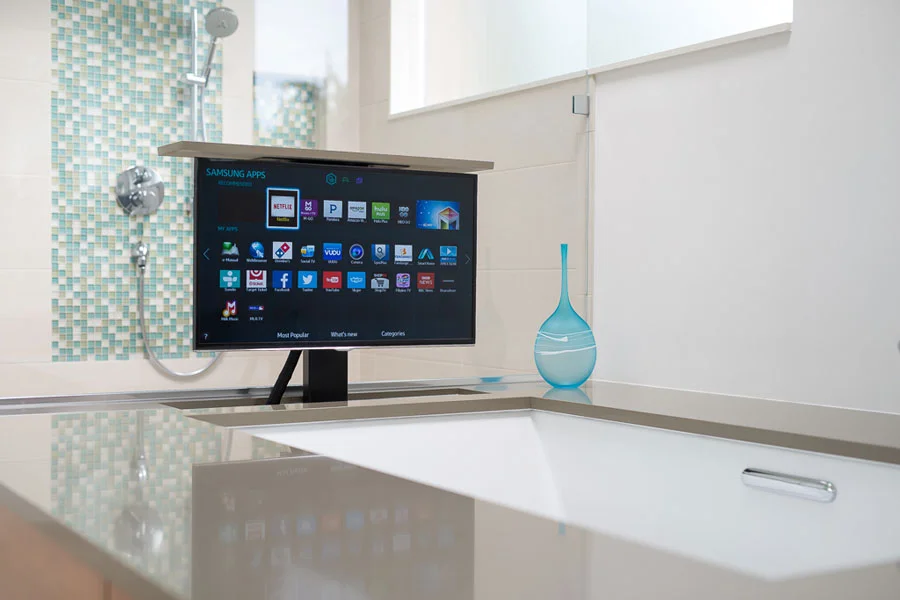 Make sure your TV comes with a wireless remote and is rated to operate at higher temperatures. Many new “smart” TVs feature internet access which can not only stream movies while you're in the tub, but can save time in the morning by allowing you to check emails while you prepare for your day.