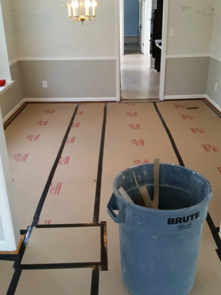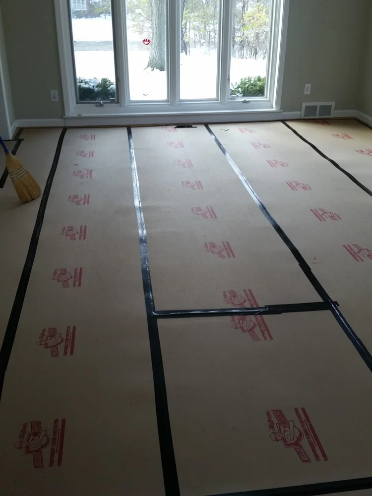 To protect the floors, we use a cardboard roll called Builders Board. It’s lightweight and easily cuts to fit the exact shape of the floor, yet sturdy enough to handle excessive wear without tearing. We tape down both sides of the cardboard to ensure that it will not move while being walked on. The purpose of the protection is to, first of all, make everyone aware of the need to be careful, and second, to protect the floor from dirt and denting in case of any dropped material or tools.