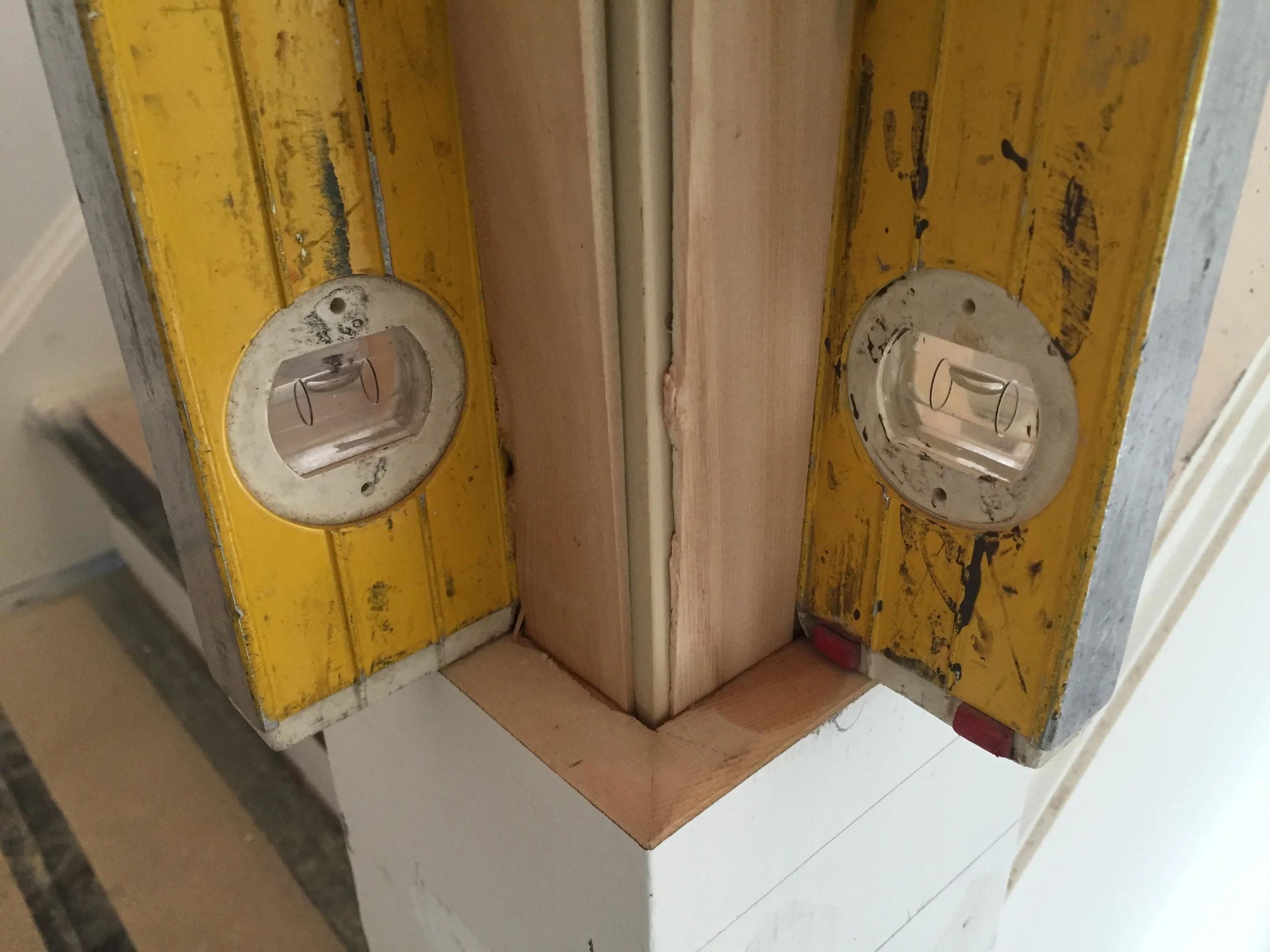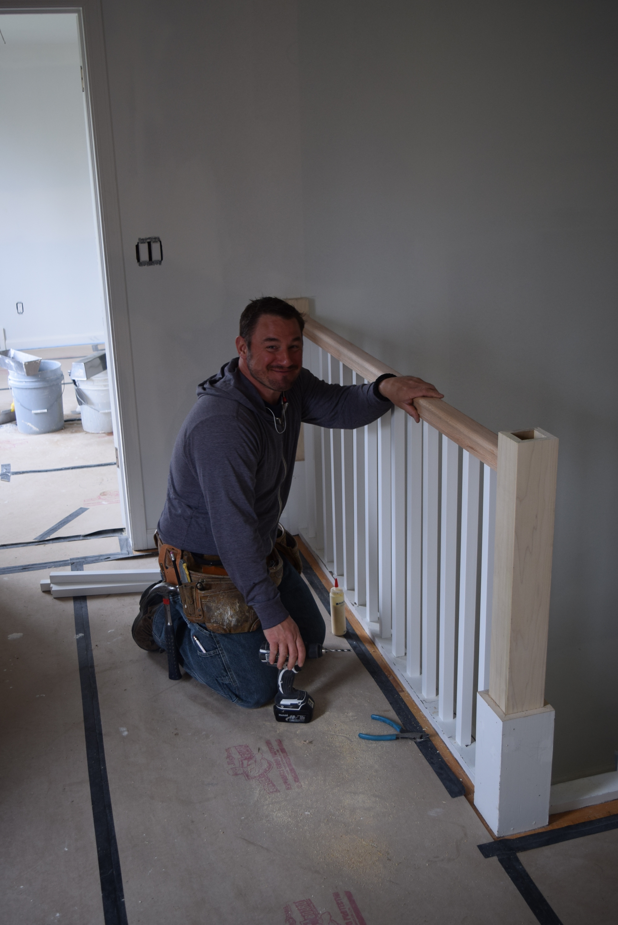 Below we see Matt working hard for a seamless fit and finish to this beautiful staircase. The new caps on the post and the railing were chosen to be stained grade to match the hardwood floors, while the balusters will remain paint grade. As soon as the post and rail are stained, the stairs will be done!