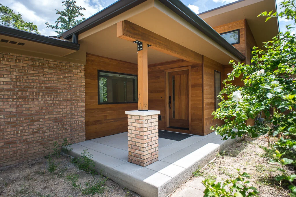 While staying true to the mid-century modern home and keeping to the transitional Japanese craftsman design aesthetic, an addition was constructed to increase space for the entry way and master closet and to open up the kitchen. Clerestory windows and additional large windows were installed to bring natural light into the space and white counter tops and walls were chosen to intensify the light even further.