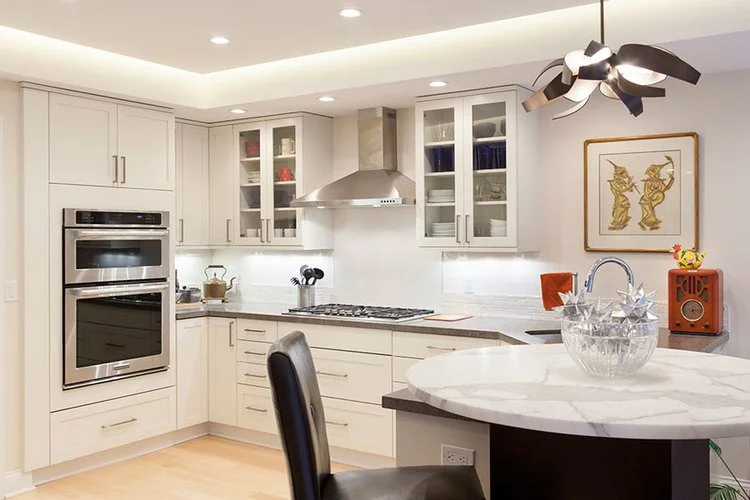 By knocking down a few walls between the great room and kitchen, this condo was transformed into a large, inviting, light-filled space. The kitchen was expanded to incorporate an innovative eat-in breakfast bar and white cabinets and marble counter tops were chosen to reflect the contemporary design. Elegant lighting fixtures and recessed lighting were used to produce a well-lit interior environment. Additional features included renovation of the bathrooms, improvement to the fireplace in the den, and storage solutions throughout the design.