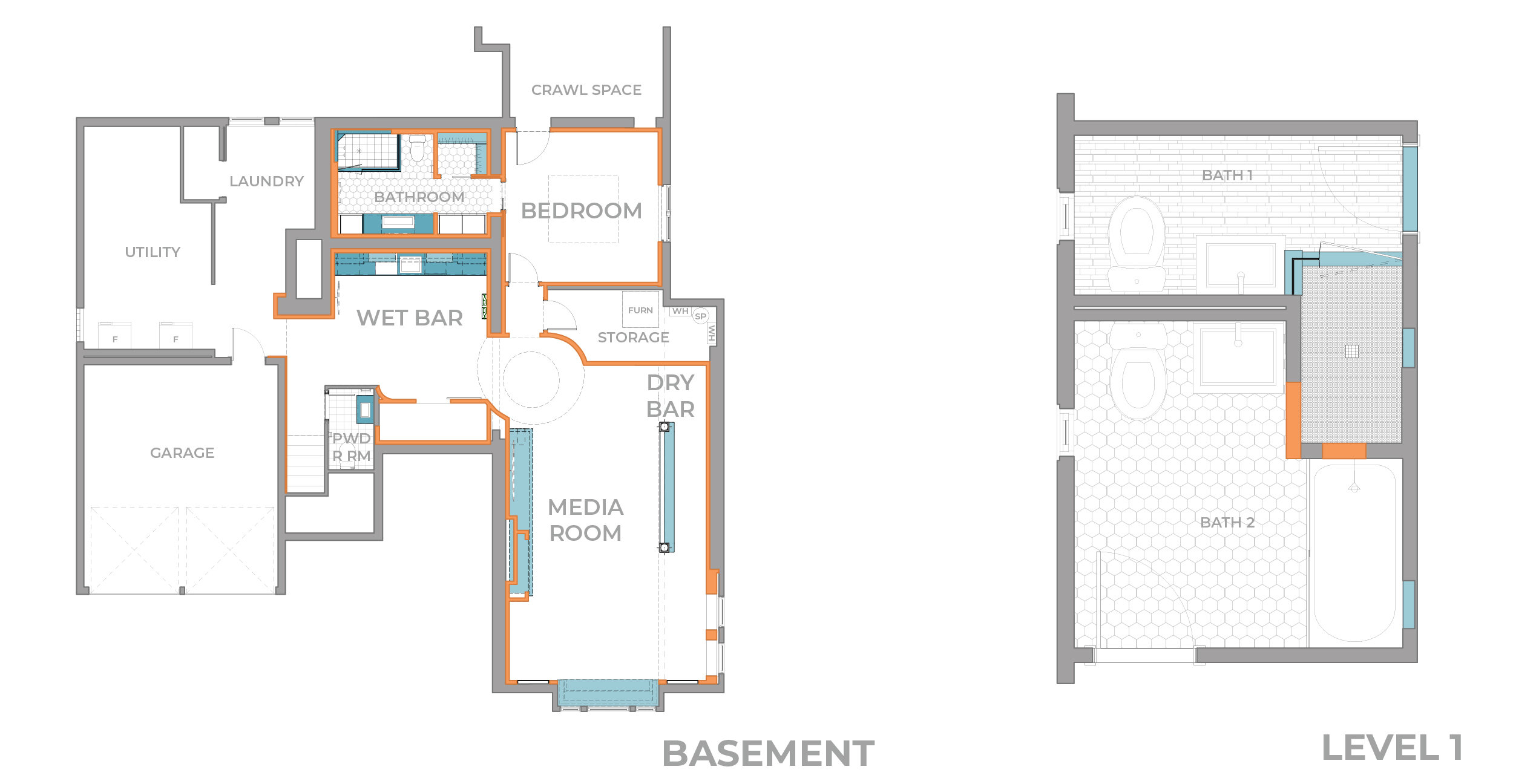 Every element of the basement floor plan is designed to pull you down the stairs immediately to the wet bar followed by curved walls that invite you further into the main recreation area.