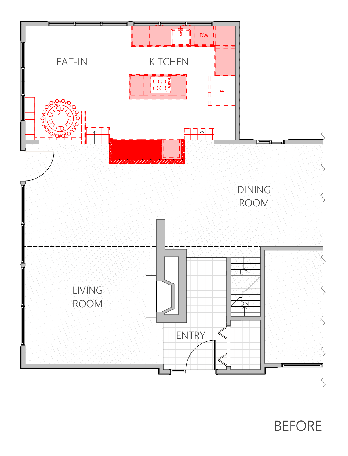 The existing kitchen had a large wall dividing it from the living room. A spiral staircase in the kitchen led down to the basement, which was not a main route to the basement and was rarely used.